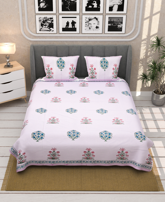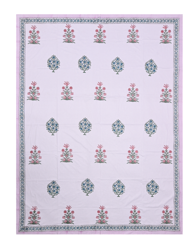 Our Block print bedsheet set is hand printed with love in a beautiful combination of pastel pink / red , purpel and green colors . The block print bedsheet features an all over floral motif in pastel pink and green and a border in beautiful pink . Our favorite pick for a bohemian inspired whimsical bedroom!