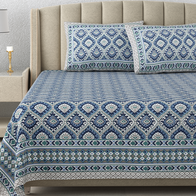 Decama 300 TC Premium 100% Cotton King Size Bedsheet with 2 Pillow covers- 90 x 108 Inches – Ikat Blue
